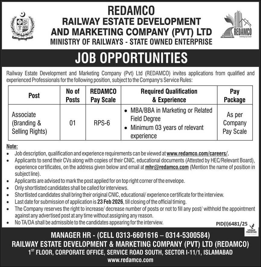 Railway Estate Development and Marketing Company Jobs 2026 Ministry of Railways REDAMCO Job Ad shown on this page is taken from Express Newspaper on 08-02-2026