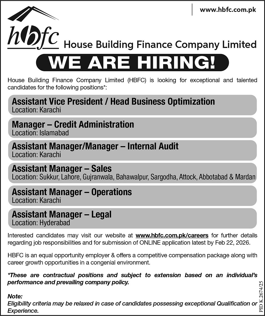 House Building Finance Company Jobs 2026 Apply Online Assistant Managers & Others HBFC Latest Job Ad shown on this page is taken from Jang Newspaper on 08-02-2026