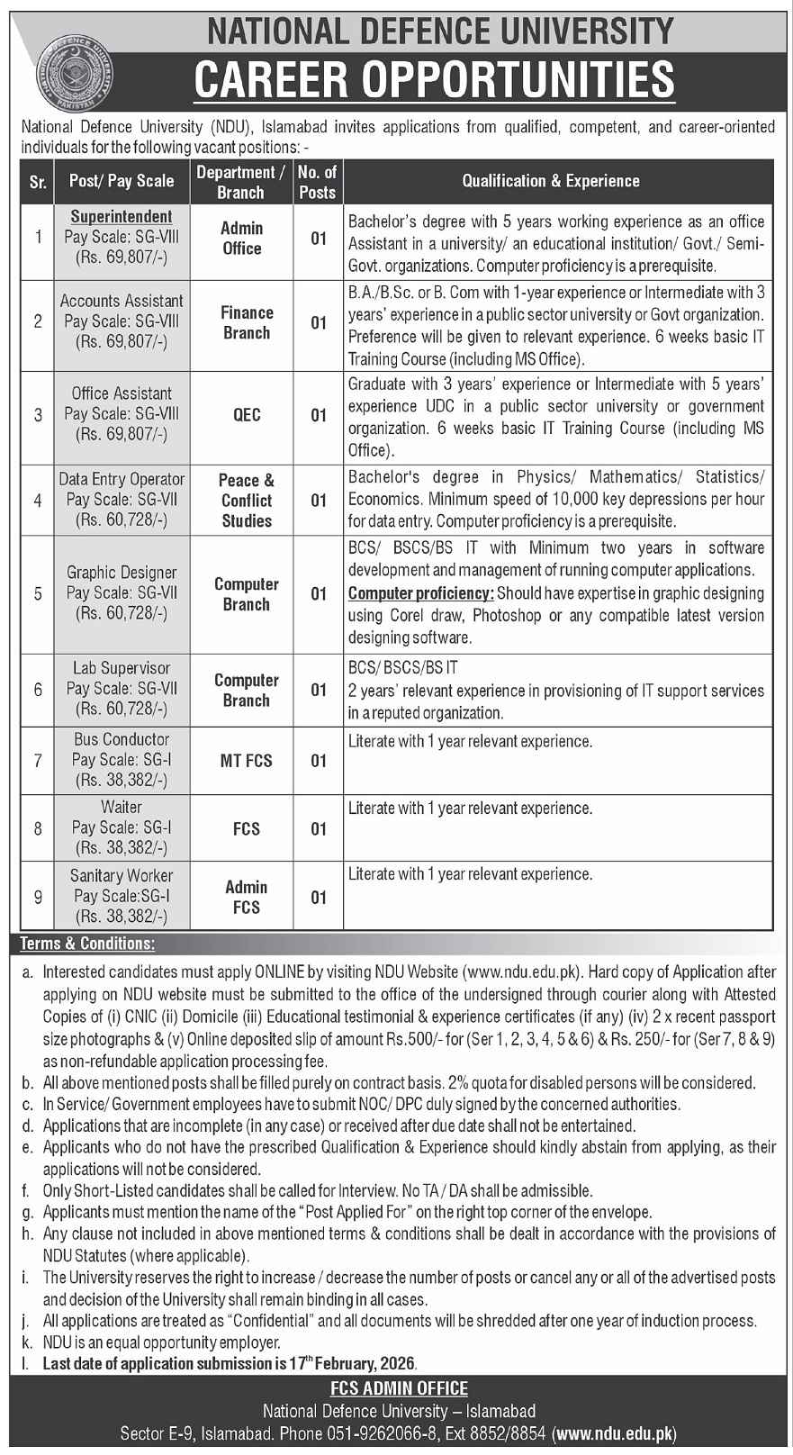 Advertisement of National Defence University NDU Islamabad Jobs 2026 for Non-Teaching Staff Apply Online-295763