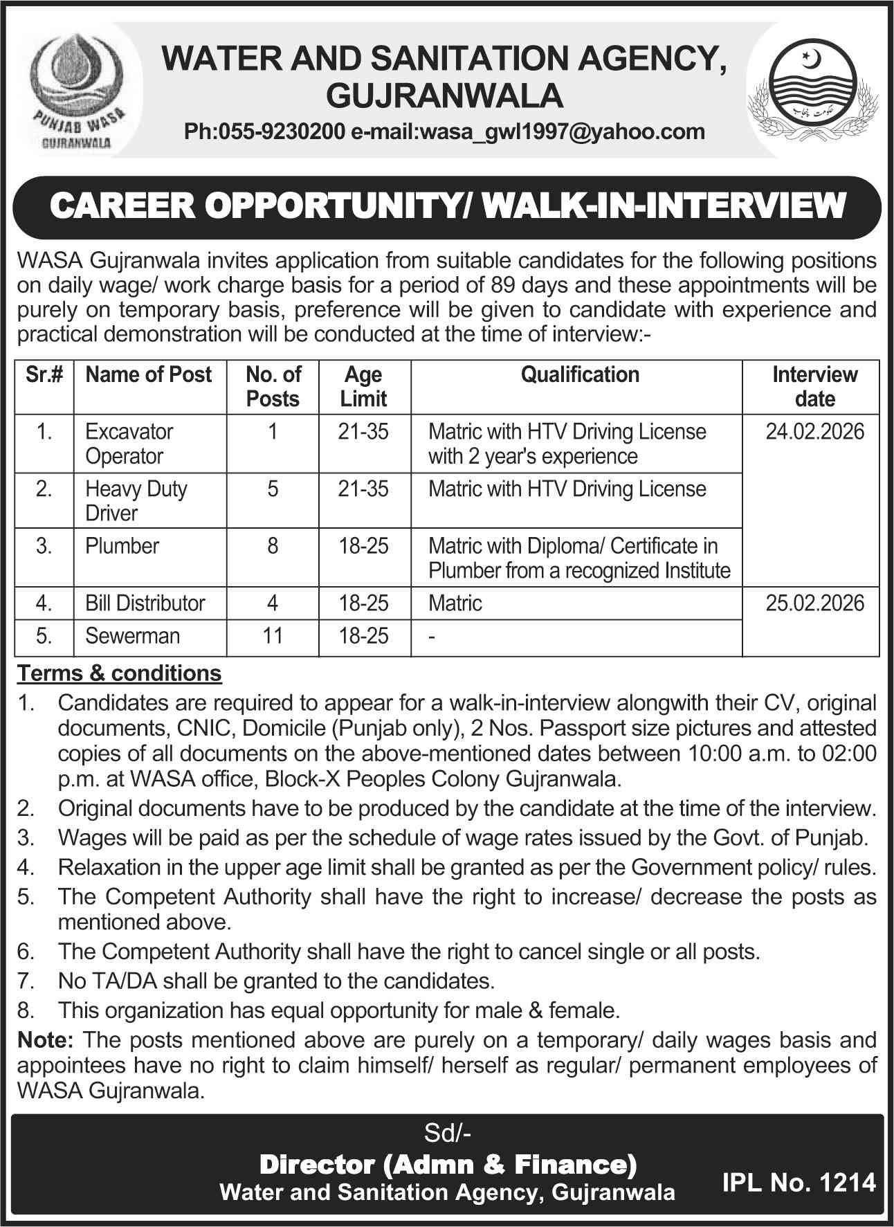 Water and Sanitation Agency WASA Gujranwala Jobs 2026 for Drivers, Plumbers, Sewerman & Others Job Ad shown on this page is taken from Express Newspaper on 03-02-2026