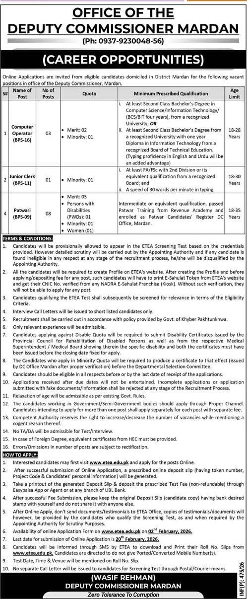 Advertisement of Deputy Commissioner DC Office Jobs 2026 for Patwari, Computer Operators & Jr Clerk-295789