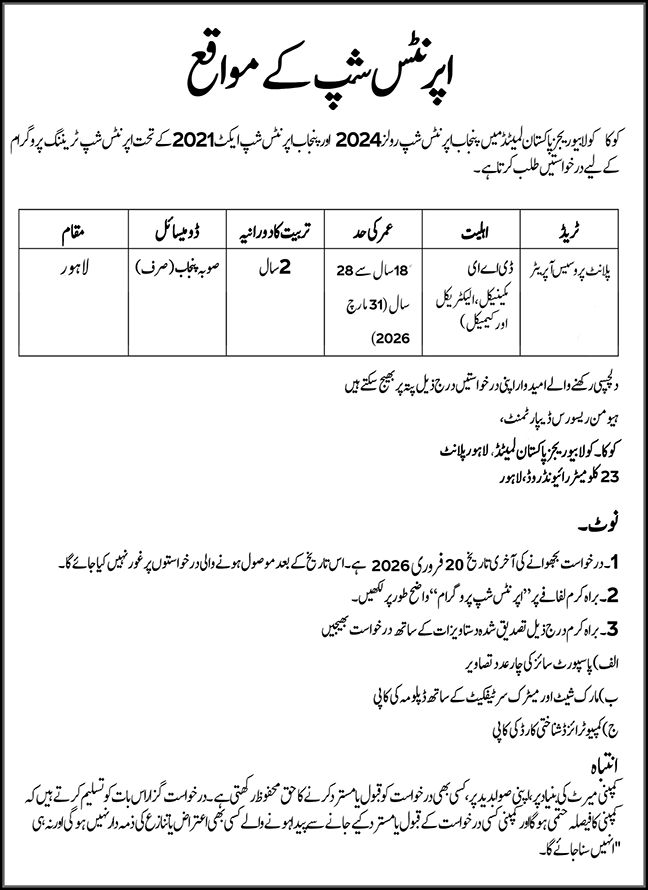 Advertisement of Coca-Cola Beverages Pakistan Apprenticeship Program 2026 at Lahore Plant -295797