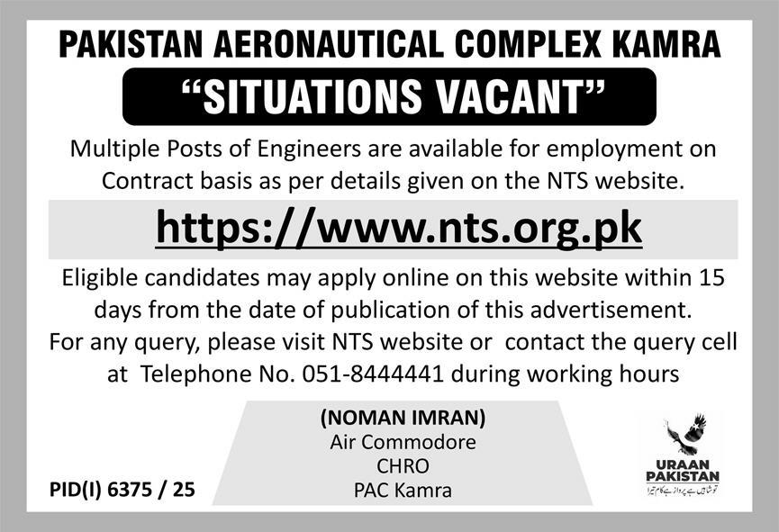 Advertisement of Pakistan Aeronautical Complex (PAC) Kamra Jobs 2026 NTS Apply Online-295802