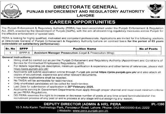 Advertisement of Punjab Enforcement and Regulatory Authority (PERA) Jobs 2026 Apply Online for Assistant Manager -295811