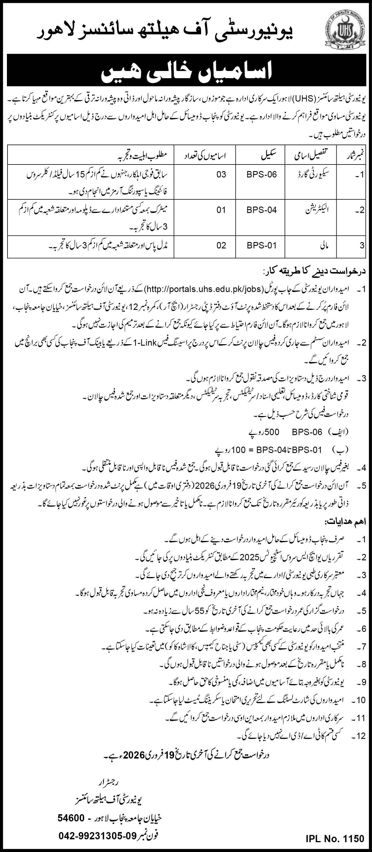 UHS Lahore Jobs 2026 Apply Online for Security Guard, Electrician & Mali Positions Job Ad shown on this page is taken from Express Newspaper on 31-01-2026