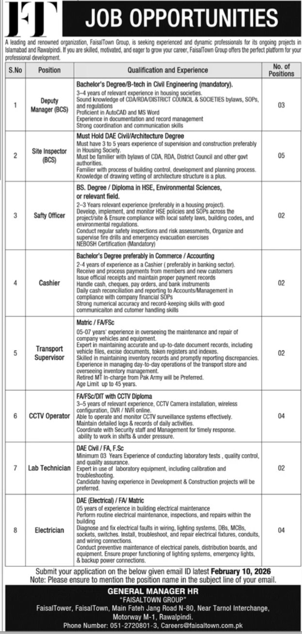 Advertisement of Faisal Town Group Jobs 2026 for Site Inspectors, Supervisors, CCTV Operators, Electricians, Cashiers & Others-295826