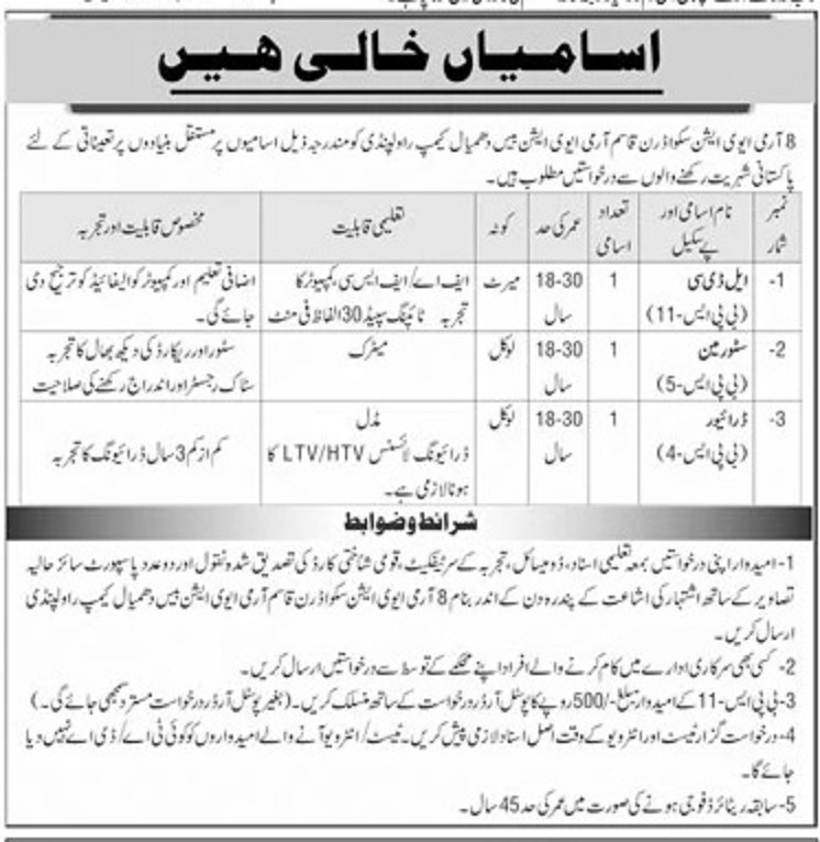 Advertisement of Pak Army Aviation Base Dhamial Camp Rawalpindi Jobs 2026 for Clerk, Driver & Storeman-295844
