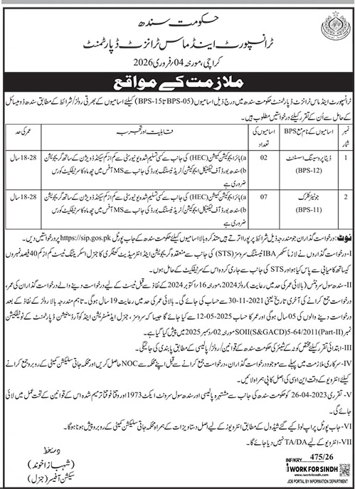 Transport and Mass Transit Department Sindh Jobs 2026 Apply Online for Jr Clerks & Assistants Job Ad shown on this page is taken from Jang Newspaper on 10-02-2026