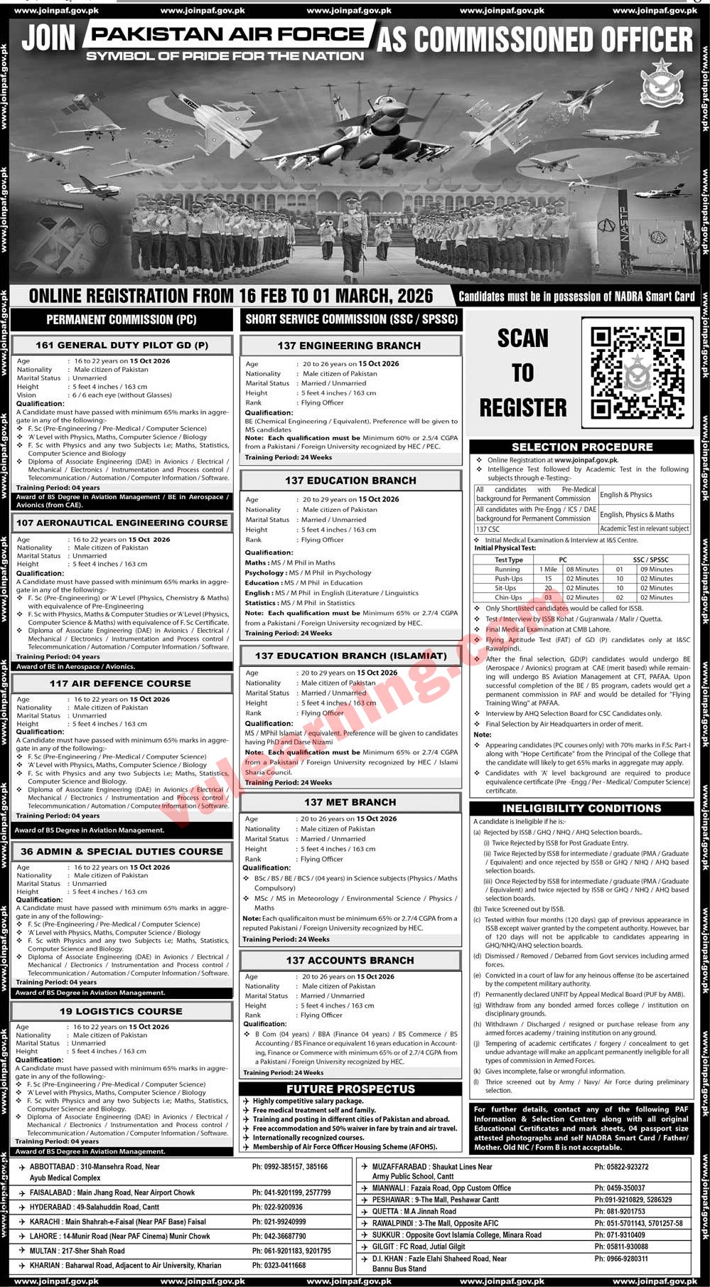 Join Pakistan Air Force as Commissioned Officer 2026 Online Registration SSC, SPSSC & Permanent Commission Latest Job Ad shown on this page is taken from Nawa-e-waqt Newspaper on 15-02-2026