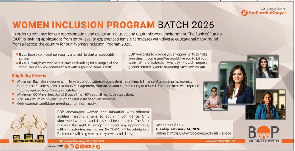 Advertisement of Bank of Punjab Women Inclusion Program 2026 Apply Online BOP Jobs Latest-295862