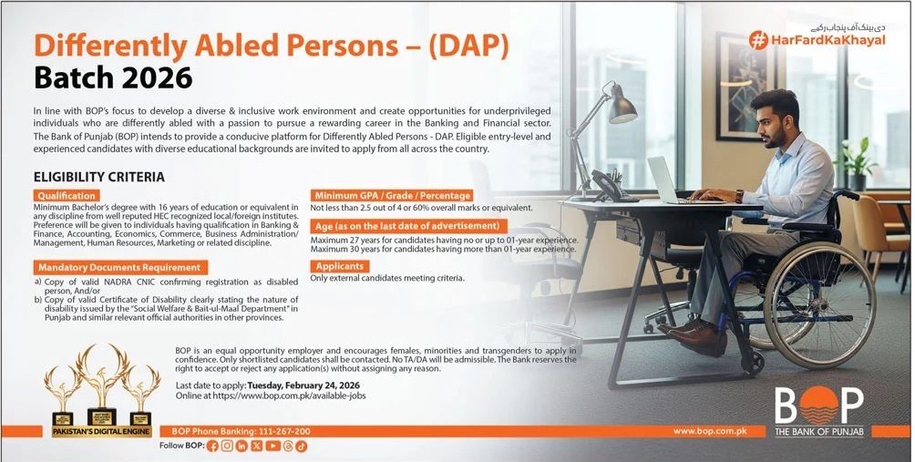 Bank of Punjab Jobs 2026 Apply Online for Differently Abled Persons DAP Batch BOP Latest Job Ad shown on this page is taken from Jang Newspaper on 15-02-2026