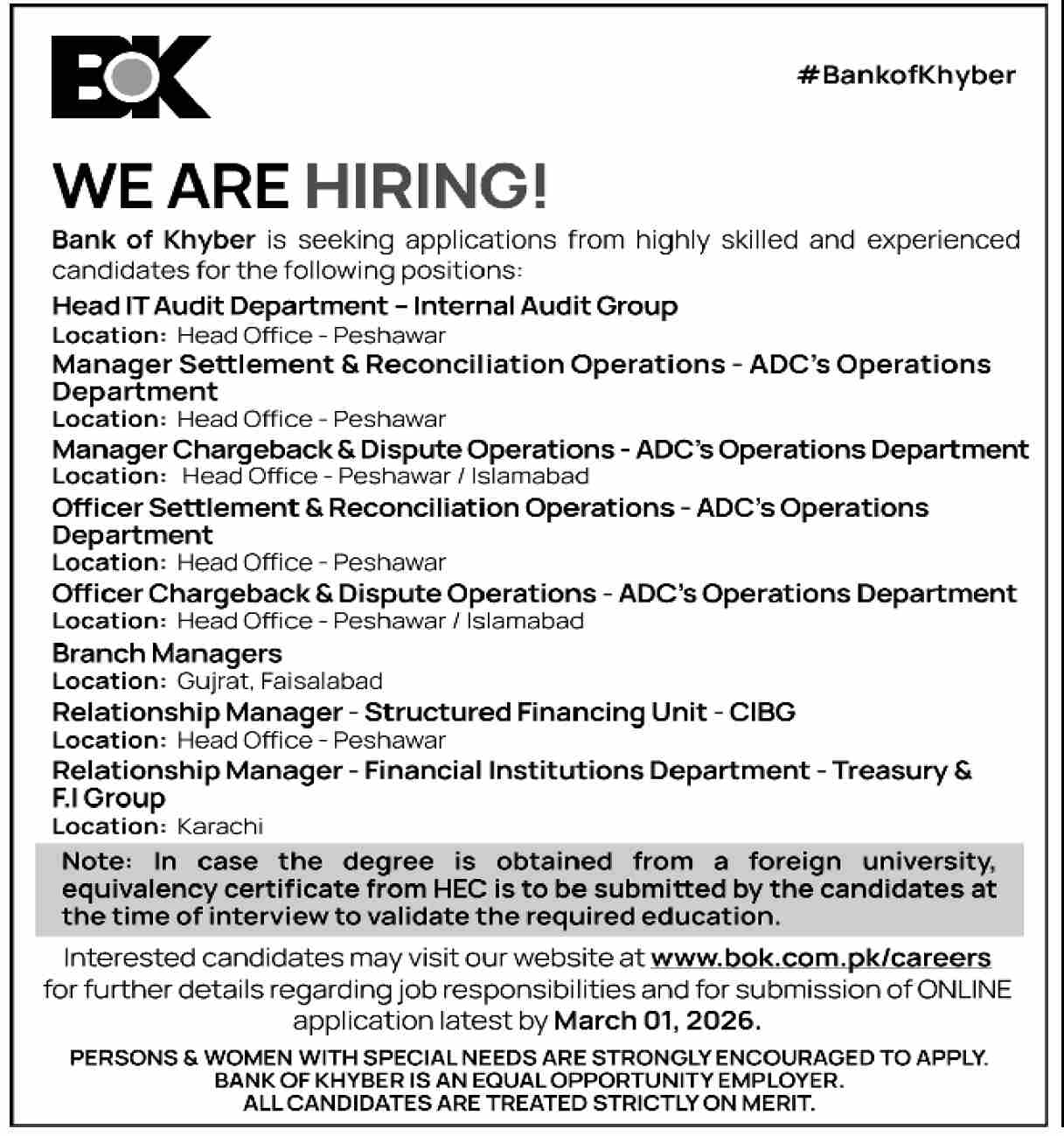 Bank of Khyber Jobs 2026 Apply Online Branch Managers, Relationship Managers & Others BOK Latest Job Ad shown on this page is taken from Dawn Newspaper on 15-02-2026