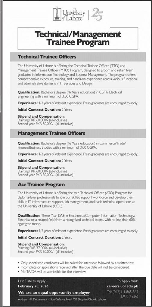 University of Lahore Technical / Management Trainee Program 2026 Apply Online UOL Latest Job Ad shown on this page is taken from Jang Newspaper on 15-02-2026