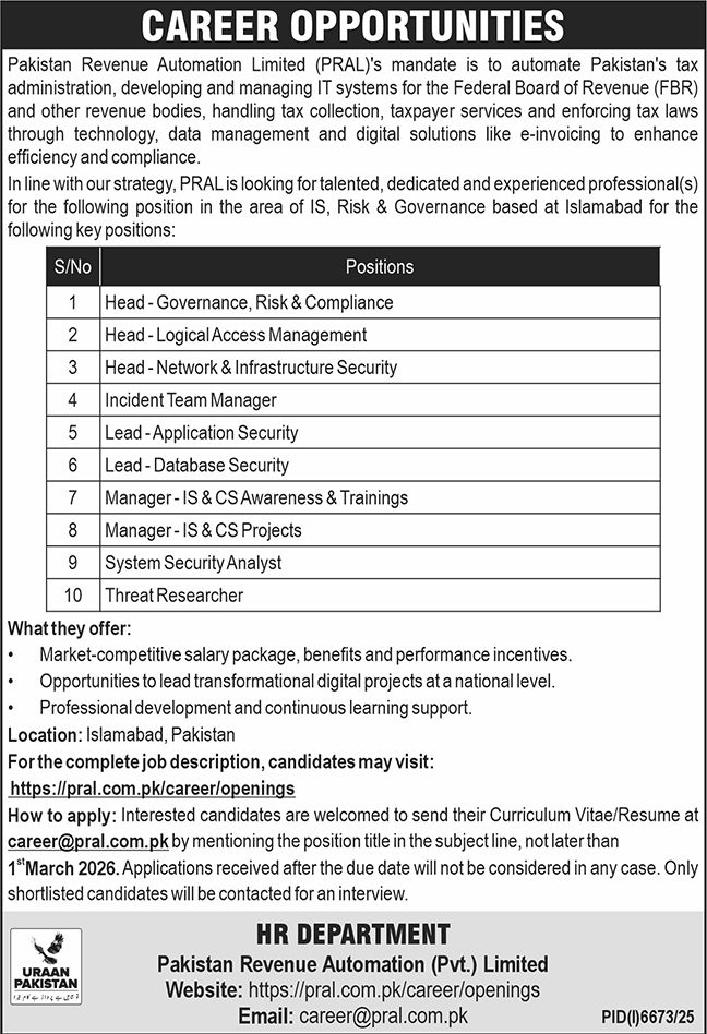 Advertisement of Pakistan Revenue Automation Pvt Ltd Islamabad Jobs 2026 FBR PRAL Latest-295872