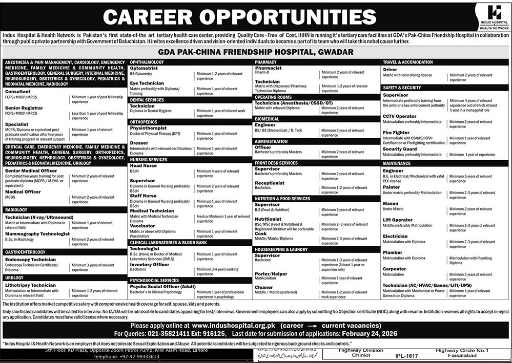 Indus Hospital Gwadar Jobs 2026 Online Apply GDA Pak China Friendship Hospital Latest Job Ad shown on this page is taken from The News Newspaper on 15-02-2026