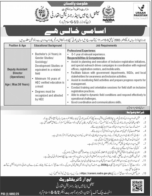 Advertisement of NADRA Islamabad Jobs 2026 Apply Online for Deputy Assistant Directors-295886