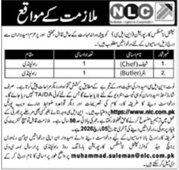 Advertisement of National Logistics Corporation NLC Jobs 2026 for Chef & Butler in Rawalpindi-295938