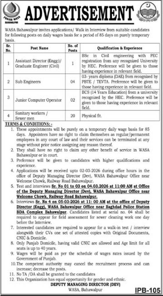 Advertisement of WASA Bahawalpur Jobs 2026 for Sub Engineers, Computer Operators, Sanitary Workers / Sewerman & Assistant Director-295953