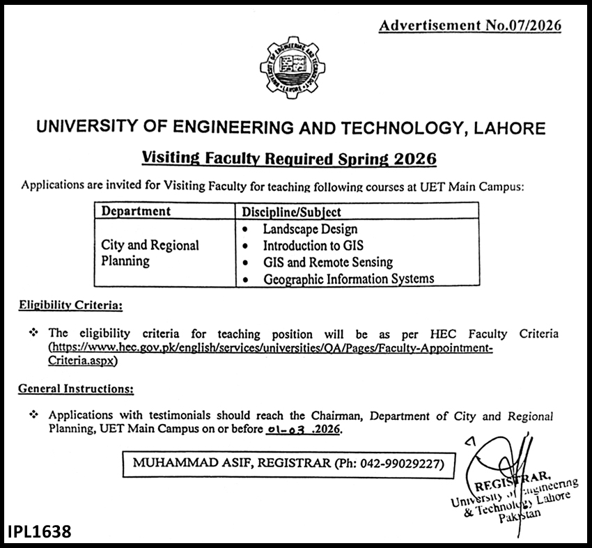Advertisement of University of Engineering and Technology (UET) Lahore Jobs 2026 for Visiting Faculty-295955