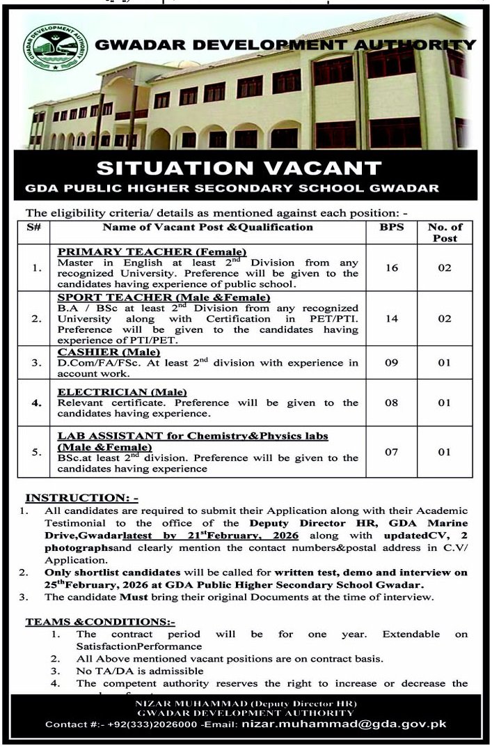 Gwadar Development Authority GDA Jobs 2026 for Teachers, Cashier, Lab Assistant & Electrician Job Ad shown on this page is taken from Jang Newspaper on 17-02-2026