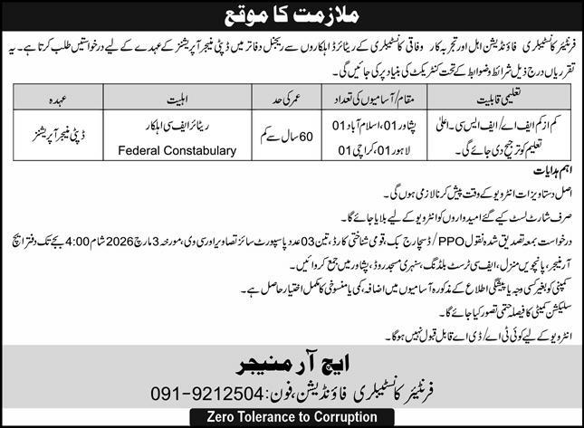 Advertisement of Frontier Constabulary (FC) Foundation Jobs 2026 for Peshawar, Islamabad, Lahore & Karachi-295960