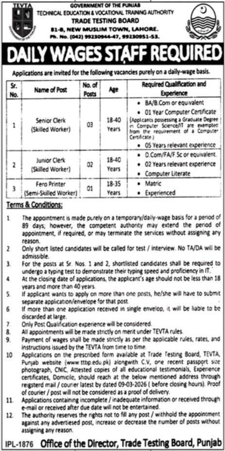 Advertisement of TEVTA Jobs 2026 for Clerks & Semi-Skilled Worker in Trade Testing Board Lahore-295971