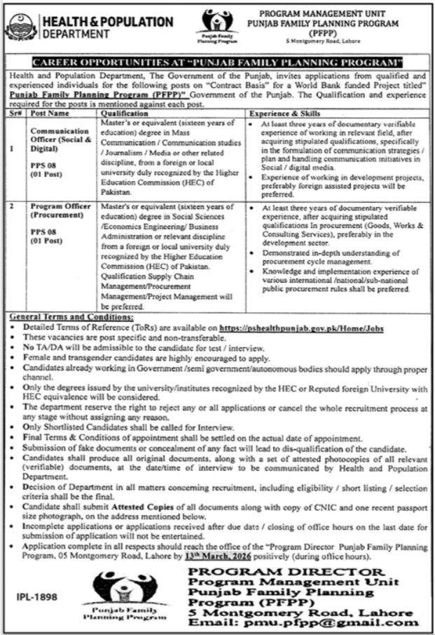Advertisement of Punjab Family Planning Program PFPP 2026 Punjab Health & Population Department-295978