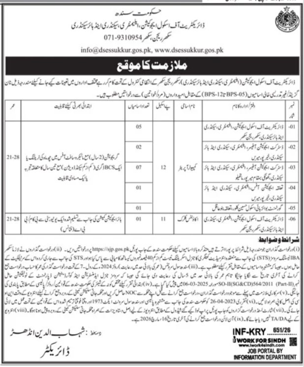 Directorate of School Education (Elementary, Secondary & Higher Secondary) Sindh Jobs 2026 Job Ad shown on this page is taken from Jang Newspaper on 21-02-2026
