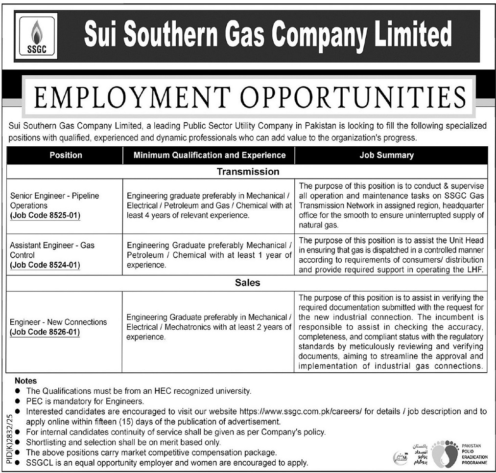 Advertisement of SSGC Jobs 2026 Apply Online Sui Southern Gas Company Career Opportunities for Engineers -295987