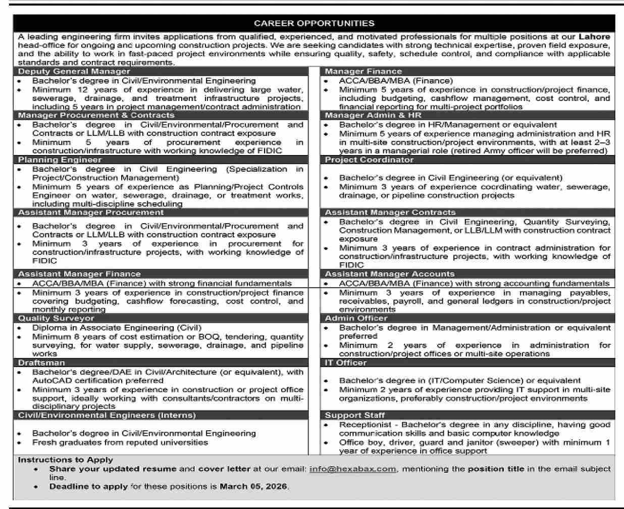 Hexabax Lahore Jobs 2026 for Assistant Managers, Admin / IT Officers & Others Latest Job Ad shown on this page is taken from Dawn Newspaper on 22-02-2026