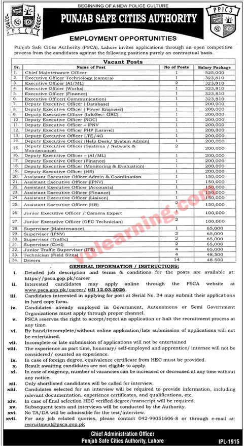 Advertisement of Punjab Safe Cities Authority PSCA Jobs 2026 Apply Online for Drivers, Assistant Executive Officers, Supervisors & Others-295994