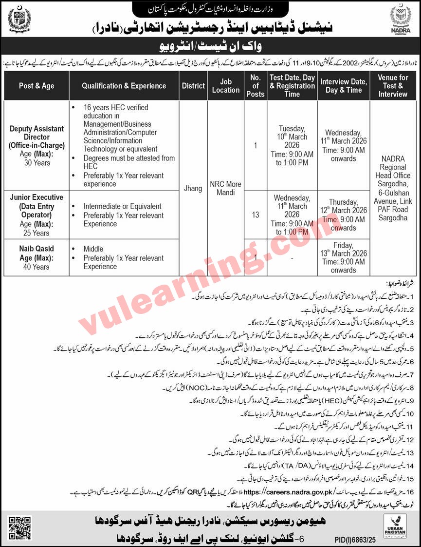 Advertisement of NADRA Jobs 2026 for Deputy Assistant Directors Jr Executives & Naib Qasid Walk-in Test / Interview-295995