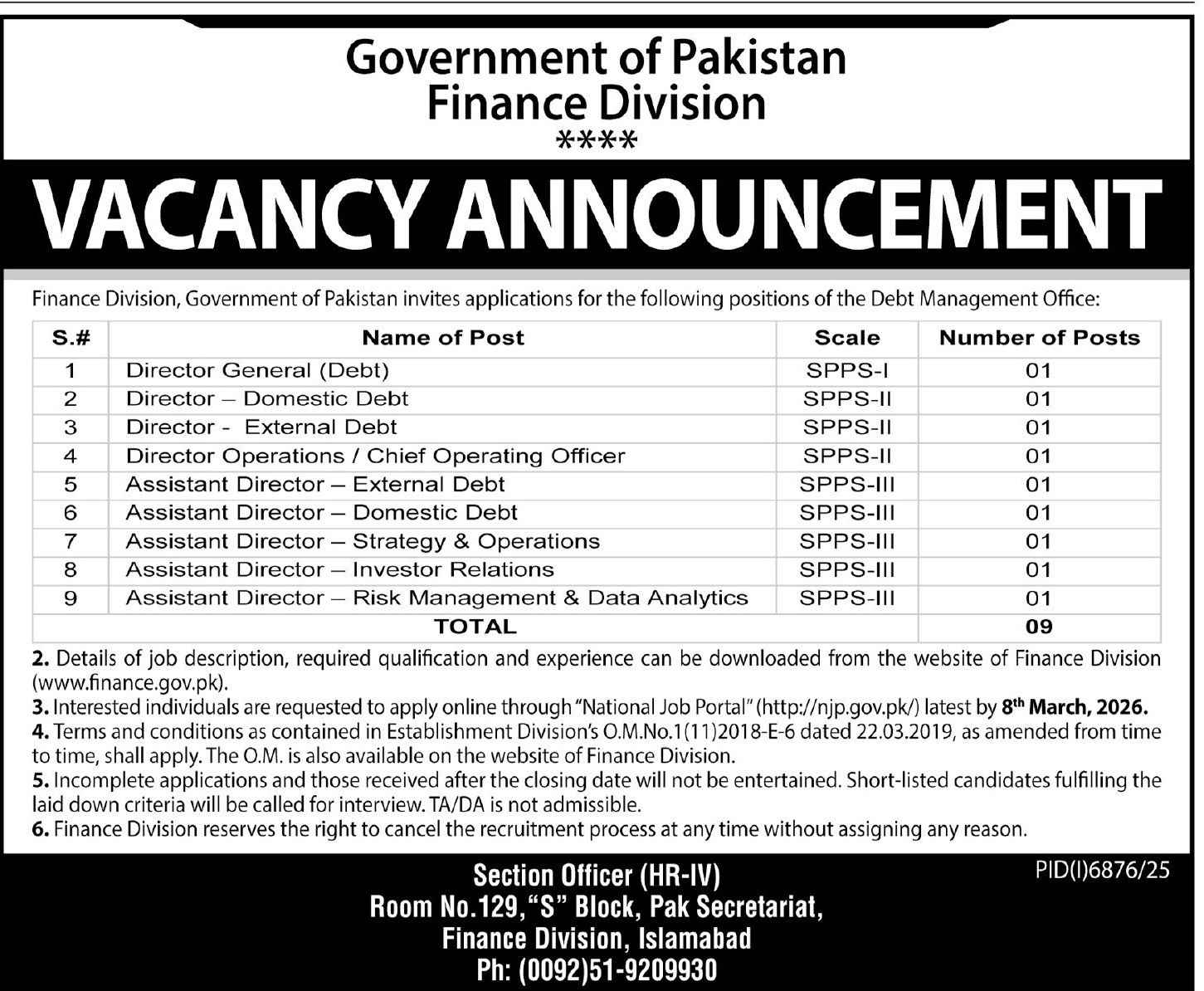 Advertisement of Finance Division Islamabad Jobs 2026 Apply Online Assistant Directors & Others Latest-296002