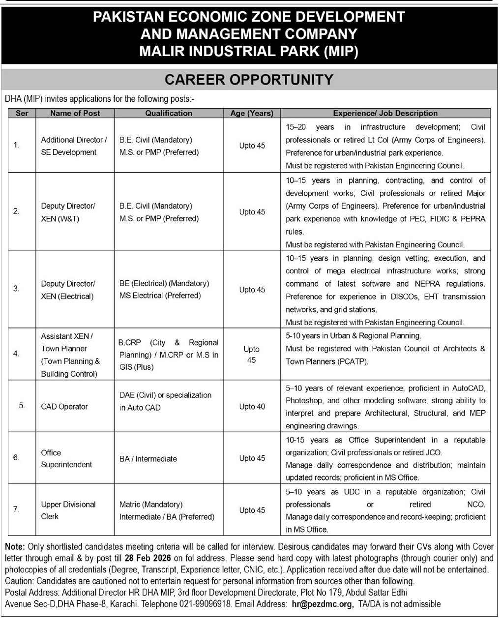 Pakistan Economic Zone Development and Management Company Jobs 2026 DHA Malir Industrial Park (MIP) Job Ad shown on this page is taken from Express Newspaper on 22-02-2026