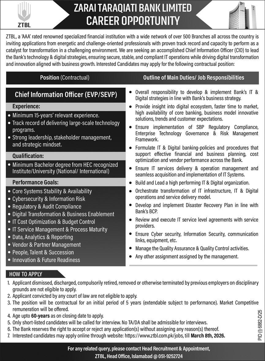 ZTBL Jobs 2026 at Head Office Islamabad Apply Online Zaria Taraqiati Bank Limited Job Ad shown on this page is taken from Express Newspaper on 22-02-2026