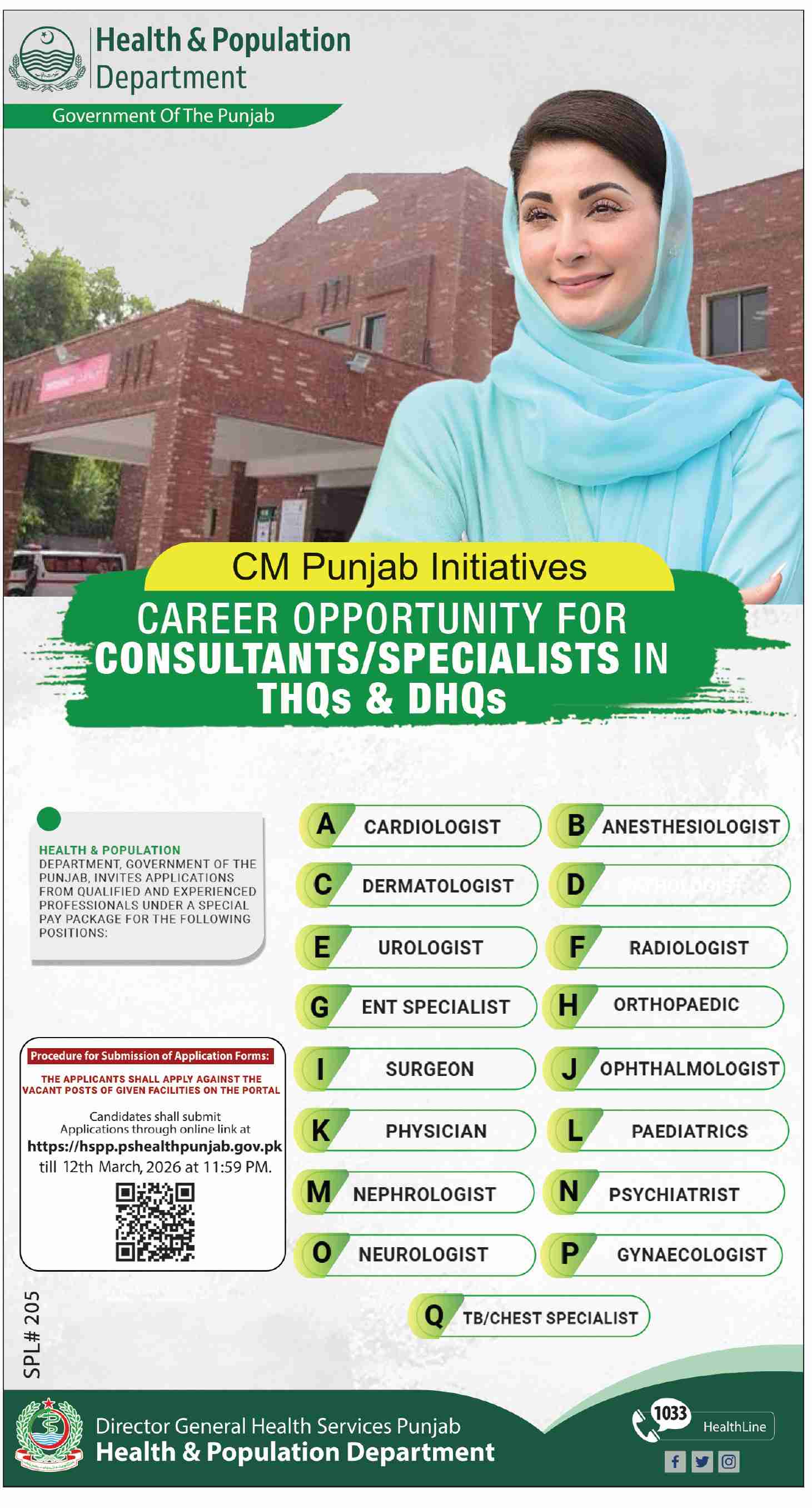 Advertisement of Health & Population Department Punjab Jobs 2026 for Medical Consultants & Specialists (DHQs & THQs) Apply Online-296022