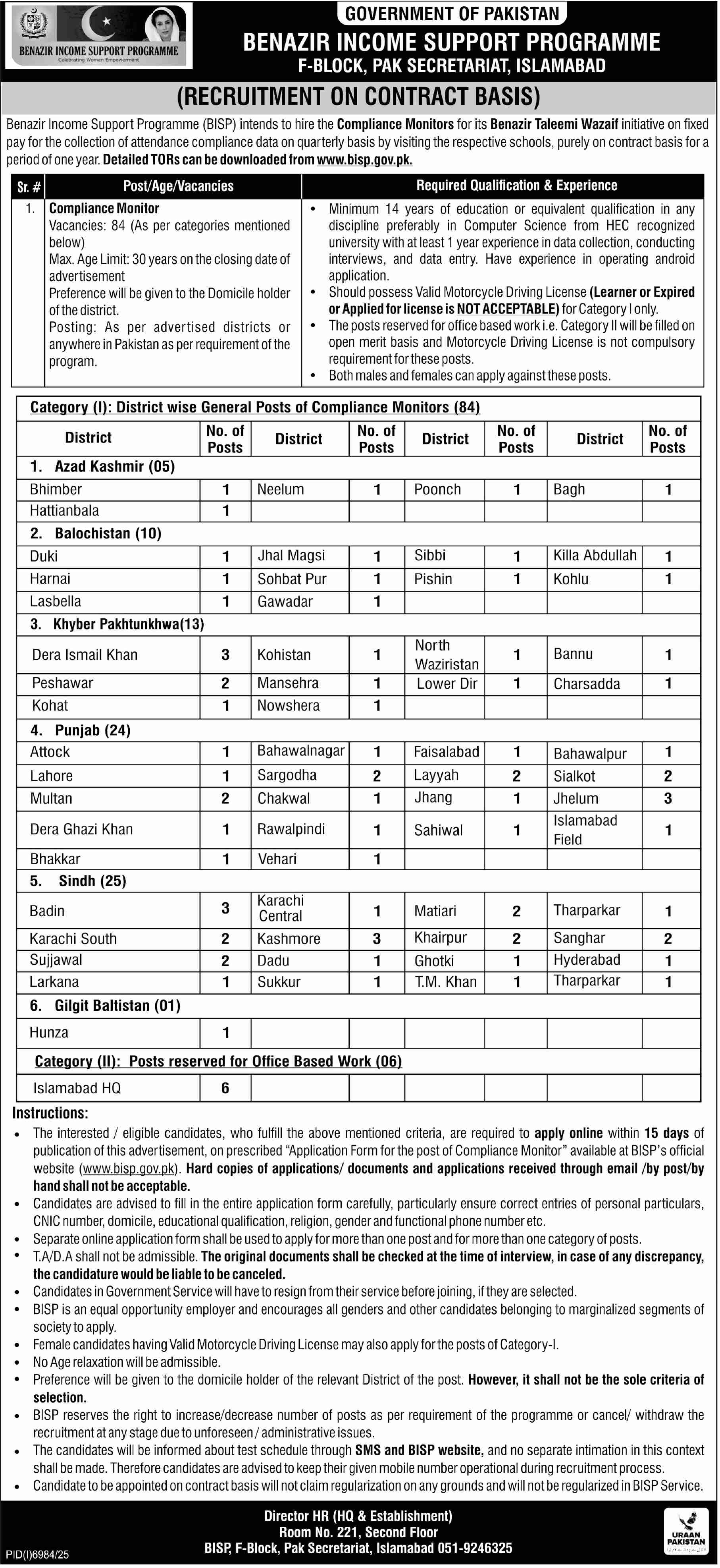 Advertisement of BISP Jobs 2026 Apply Online for Compliance Monitors Benazir Income Support Programme -296023