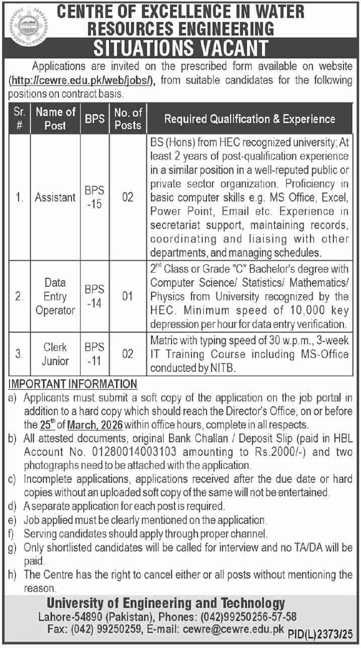 Advertisement of Centre of Excellence in Water Resources Engineering UET Lahore Jobs 2026 for Assistants, Jr Clerks & Data Entry Operator CEWRE-296029