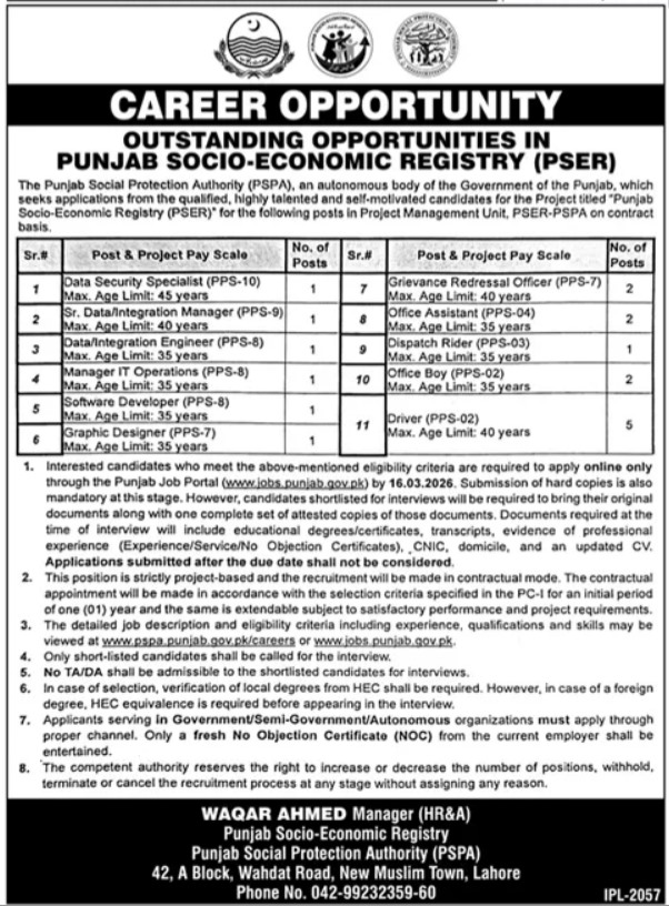 Advertisement of Punjab Social Protection Authority PSPA Jobs 2026 Apply Online for Punjab Socio-Economic Registry (PSER)-296030