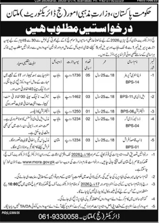 Advertisement of Ministry of Religious Affairs Jobs 2026 for Data Entry Operator, Clerk, Naib Qasid & Others at Hajj Directorate Multan-296047