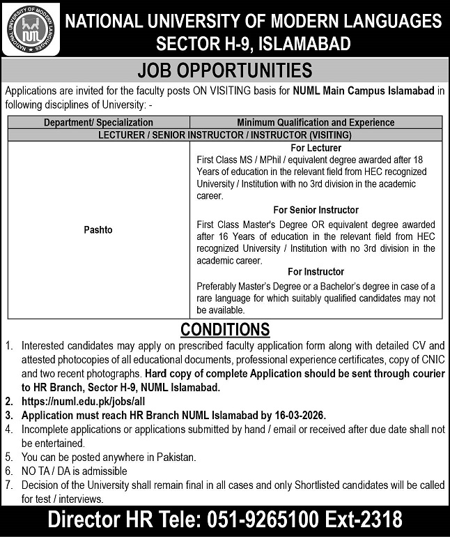 Advertisement of National University of Modern Languages NUML Islamabad Jobs 2026 for Teaching Faculty-296055