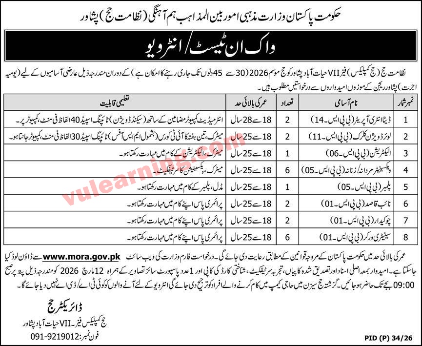 Advertisement of Ministry of Religious Affairs Jobs 2026 for Directorate of Hajj Peshawar Walk-in Test / Interviews-296058