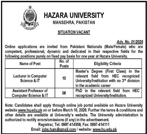 Hazara University Jobs 2026 for Lecturers & Assistant Professors Apply Online Job Ad shown on this page is taken from Jang Newspaper on 28-02-2026