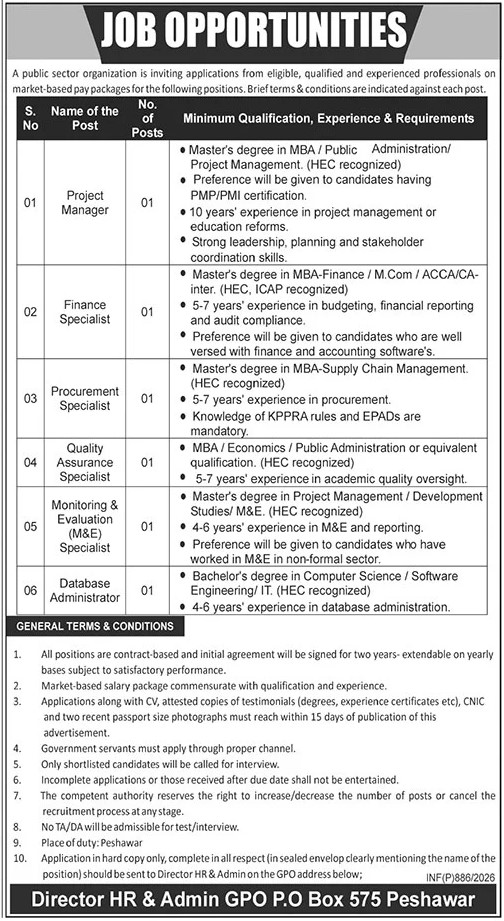 Advertisement of Public Sector Organization PO Box 575 Peshawar 2026 Vacancies Advertisement-296074