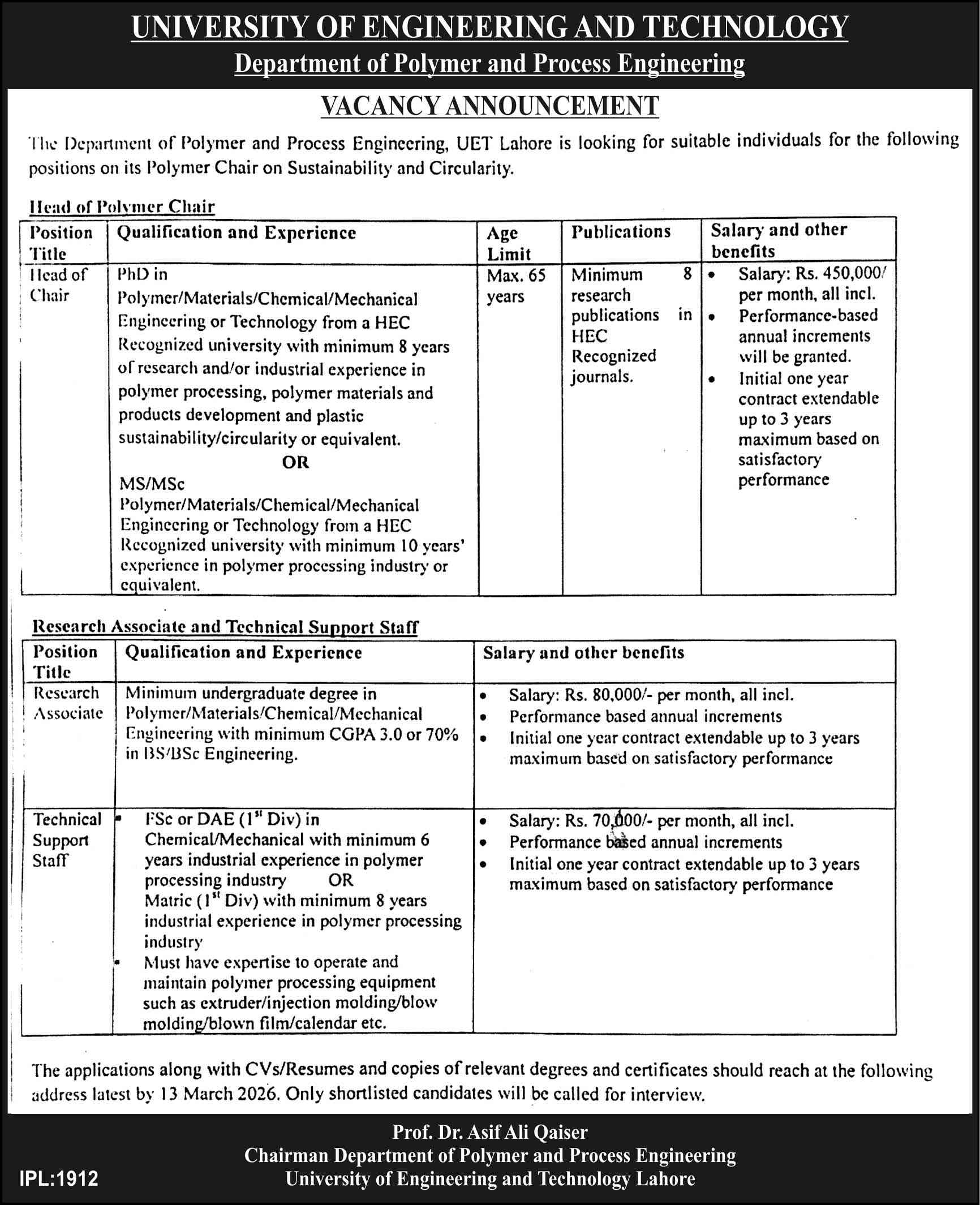 Advertisement of UET Lahore Jobs 2026 for Department of Polymer and Process Engineering-296083