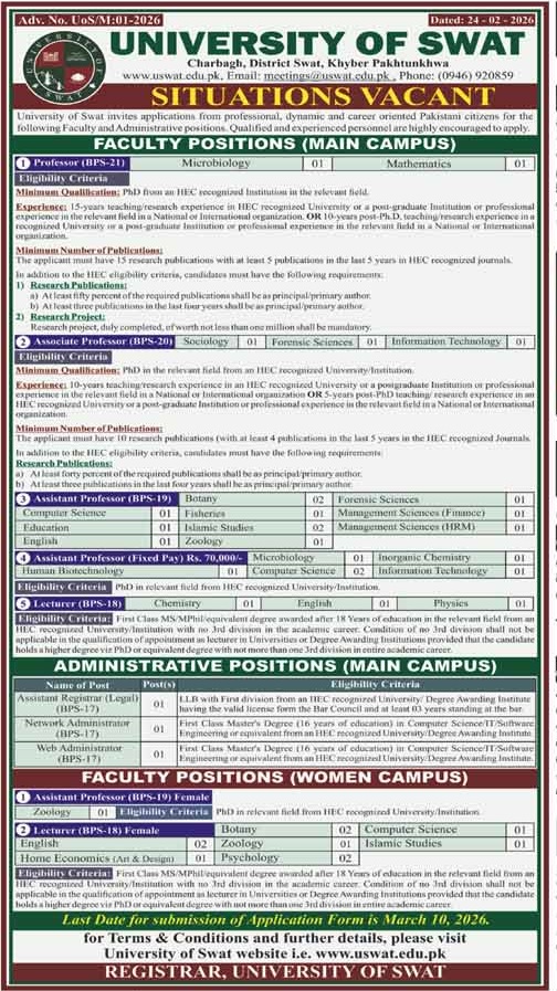 University of Swat Jobs 2026 for Teaching Faculty & Administrative Staff Job Ad shown on this page is taken from Mashriq Newspaper on 24-02-2026