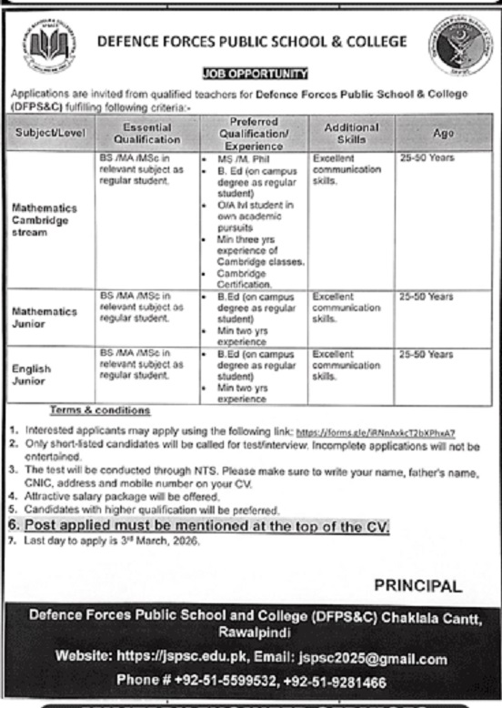 Advertisement of Defence Forces Public School & College DFPS&C Rawalpindi Jobs 2026-296093