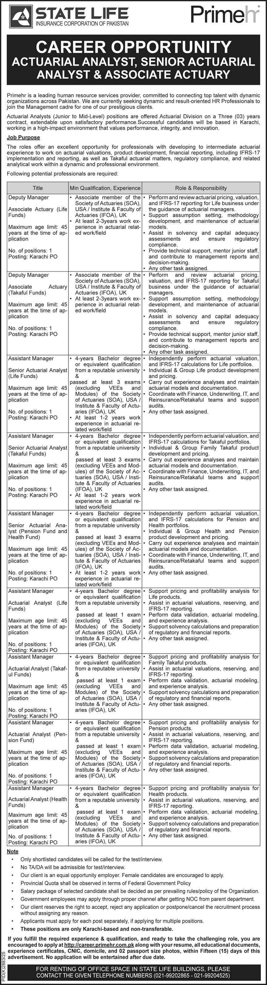 Advertisement of State Life Insurance Corporation of Pakistan Jobs 2026 Apply Online Actuarial Analysts & Actuary Associate SLIC Latest-296100