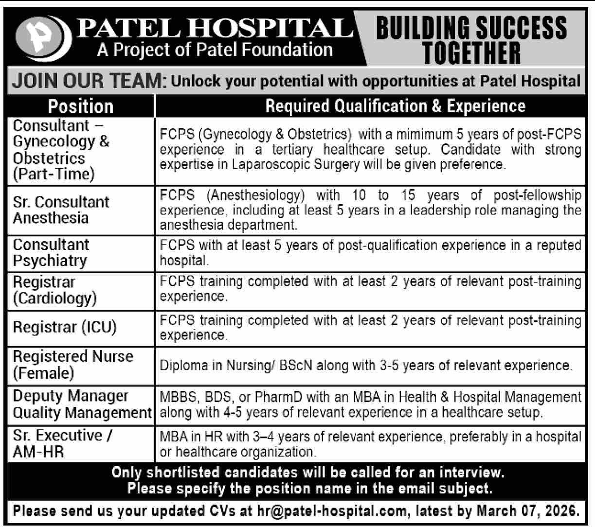 Patel Hospital Karachi Jobs 2026 for Nurses, Medical Consultants & Others Latest Job Ad shown on this page is taken from Dawn Newspaper on 01-03-2026