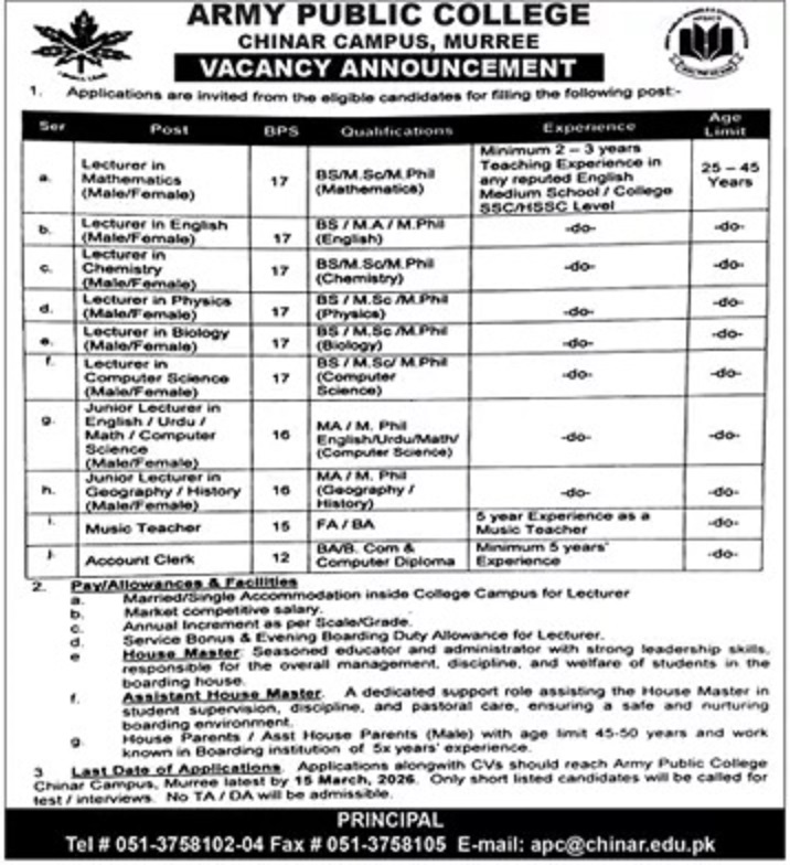 Advertisement of Army Public College Chinar Campus Murree Jobs 2026 for Lecturers, Jr Lecturers & Others Apply Online-296120